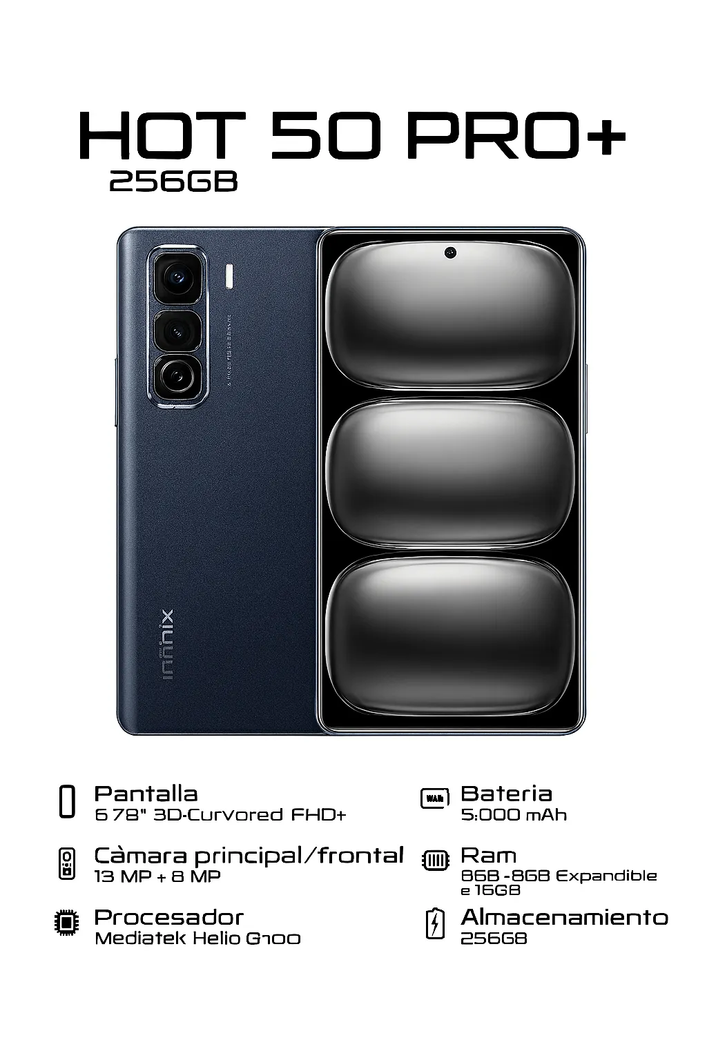 El Infinix HOT 50 Pro+ combina diseño moderno, alto rendimiento y gran capacidad de almacenamiento. Ideal para quienes buscan un smartphone potente, elegante y con excelente autonomía para el uso diario, redes sociales, juegos y multitarea.