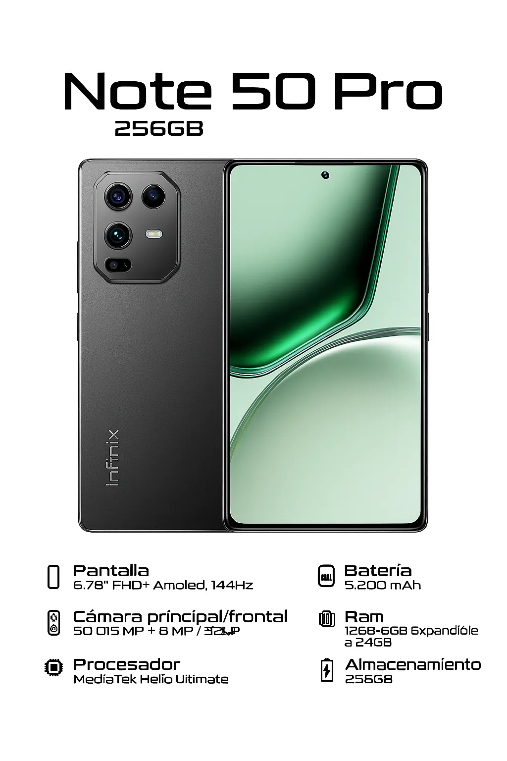 Descubre la potencia definitiva con el renovado Infinix Note 50 Pro. Este dispositivo redefine el rendimiento con hasta 24GB de RAM (12GB físicos + 12GB virtuales) y una inmersiva pantalla AMOLED FHD+ de 6.78 pulgadas. Captura fotos estables y nítidas gracias a su cámara de 50 MP con OIS y olvídate del cargador con su batería de 5,200 mAh.