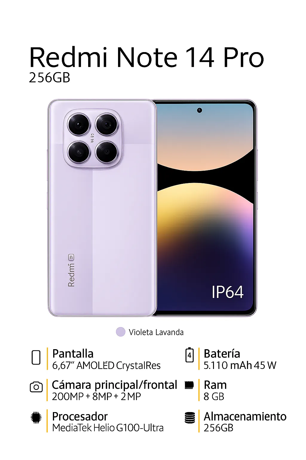 El Redmi Note 14 Pro combina elegancia y rendimiento fotográfico de alto nivel. Destaca por su sistema de cámaras de 200 MP y su impresionante pantalla AMOLED de 6.67″ con tecnología CrystalRes. Impulsado por el procesador MediaTek Helio G100-Ultra y una batería de larga duración de 5,110 mAh, es el compañero perfecto para capturar y crear contenido. Cuenta con certificación IP64 para resistencia a polvo y salpicaduras.