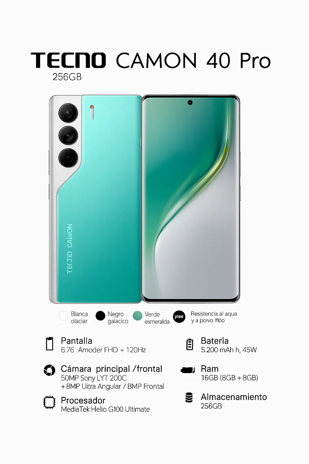 Descubre la evolución de la fotografía móvil con el Tecno Camon 40 Pro. Este dispositivo integra un sensor principal Sony LYT 200C de 50 MP para capturas profesionales. Disfruta de tus contenidos en su pantalla AMOLED FHD+ de 6.76 pulgadas a 120Hz y experimenta un rendimiento fluido con 16GB de RAM dinámica y procesador Helio G100 Ultimate. Además, cuenta con resistencia al agua y polvo.